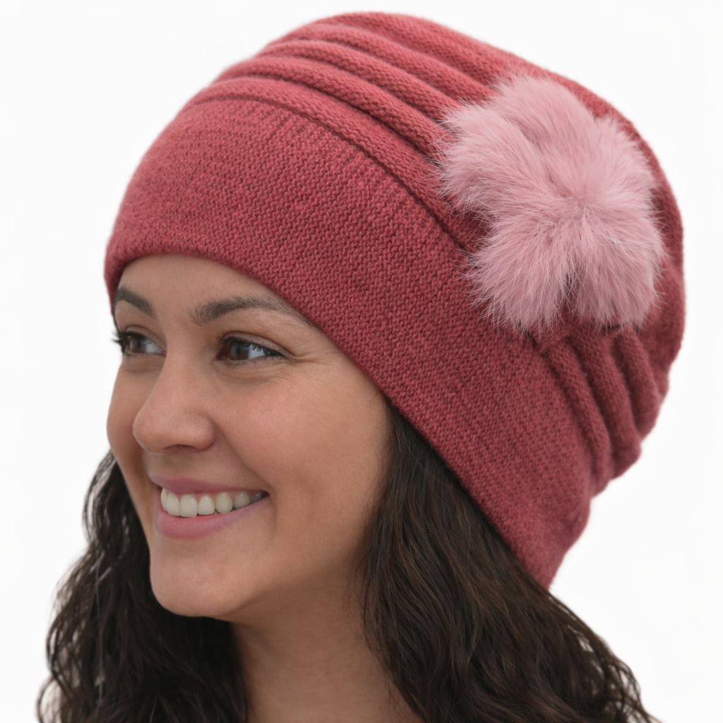 Vintage inspired brim hat , rouched body , flat fitted top, thick brim. Fur flower as photo.