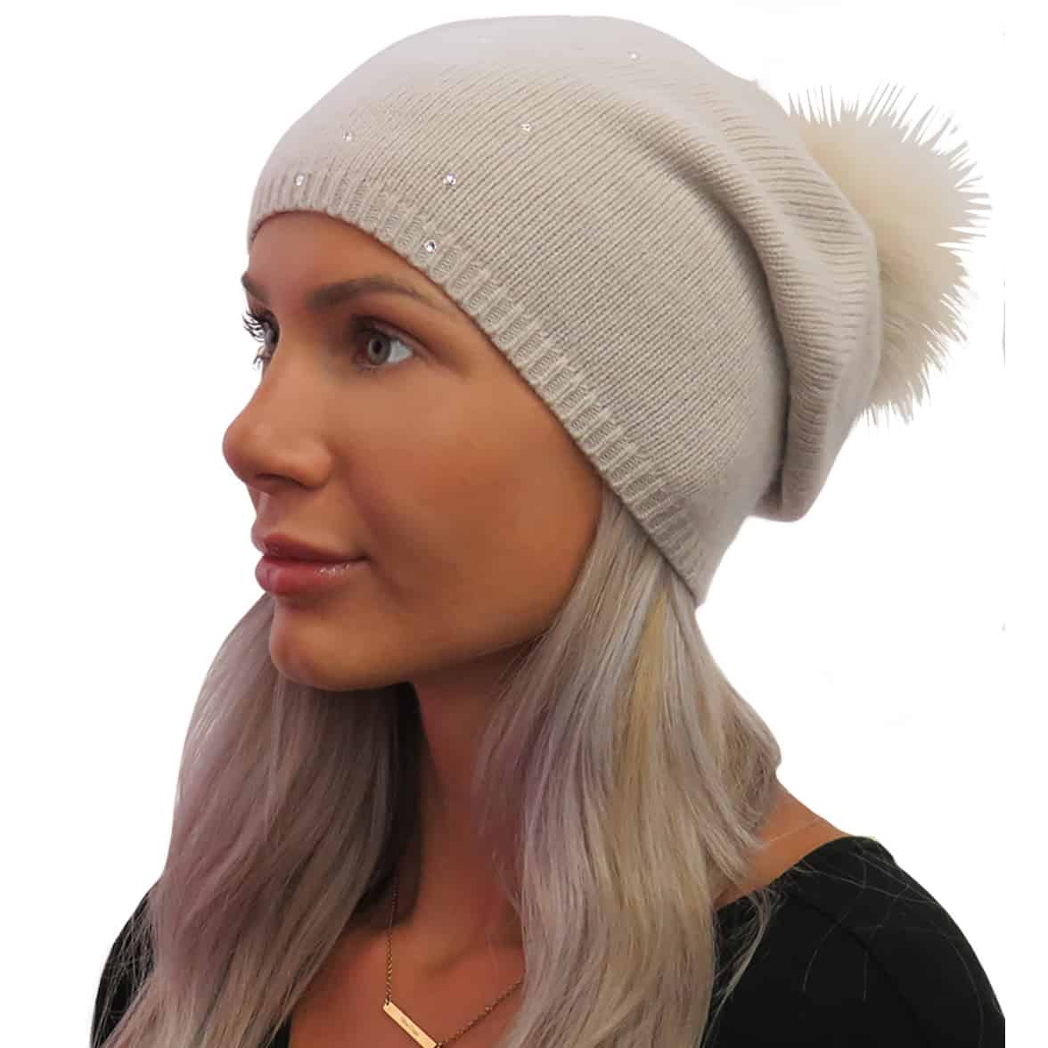 No one will call this a boyfriend hat , body in all over plain jersey with scattered delicate crystals, gathered on top with fox fur pom. 3PLY