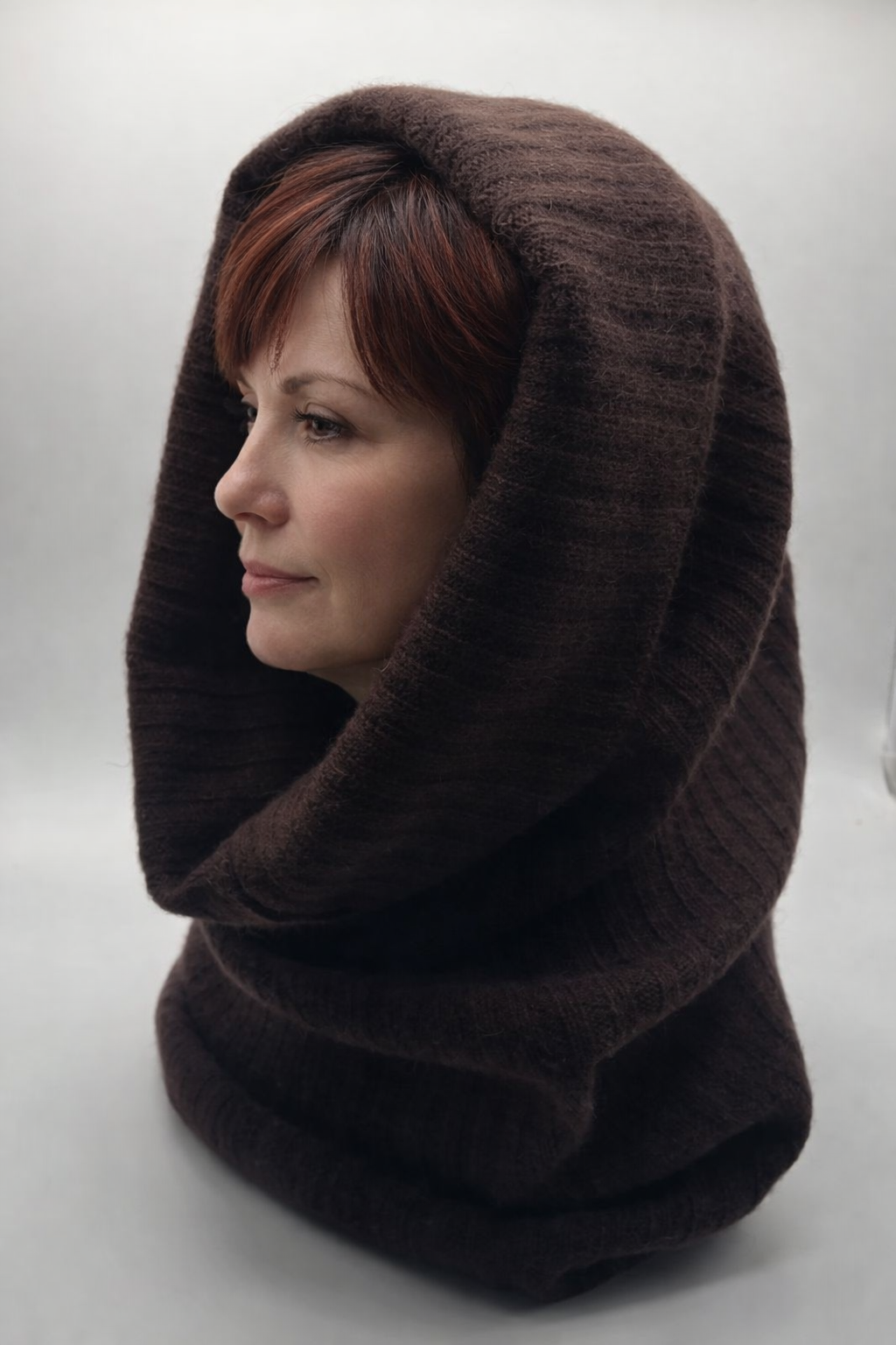 Cosy and sumptuous cashmere funnell . Wear it as a hat on the coldest days. Ribbed. 12.5 x 30 inches finished.