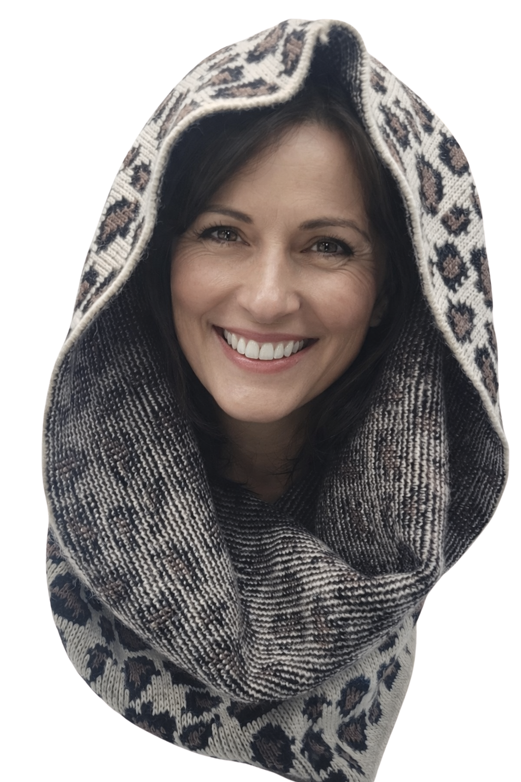 Cashmere funnel , 15x20 unches, glorious 4 ply 7gg , jacquard animal print. The reverse "tweed" is as striking as the finished animal print side