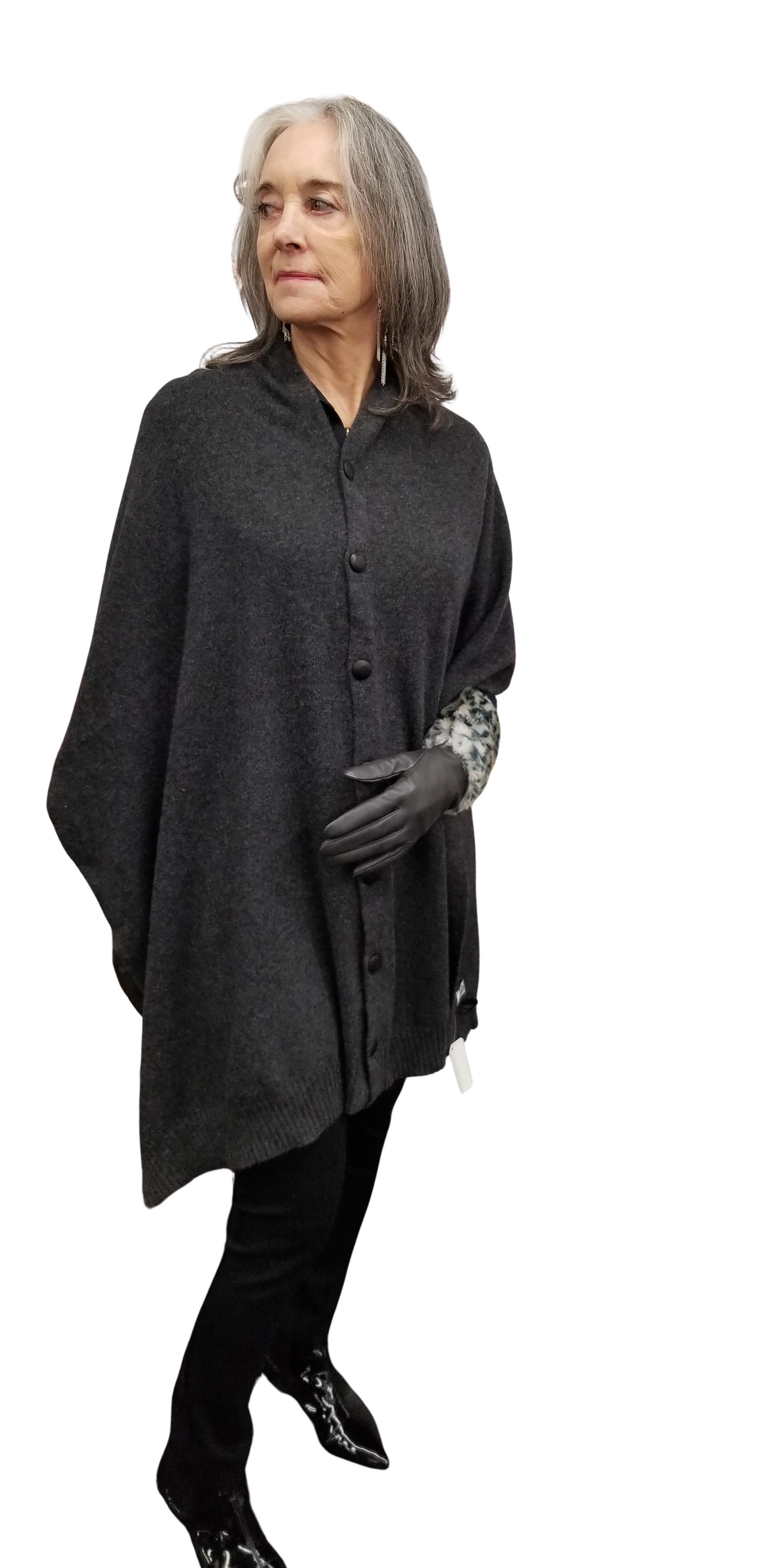 Can be worn as a poncho with Buttons in Front or asymetrically on one shoulder.  Wear it as a Scarf and style the button's freely.