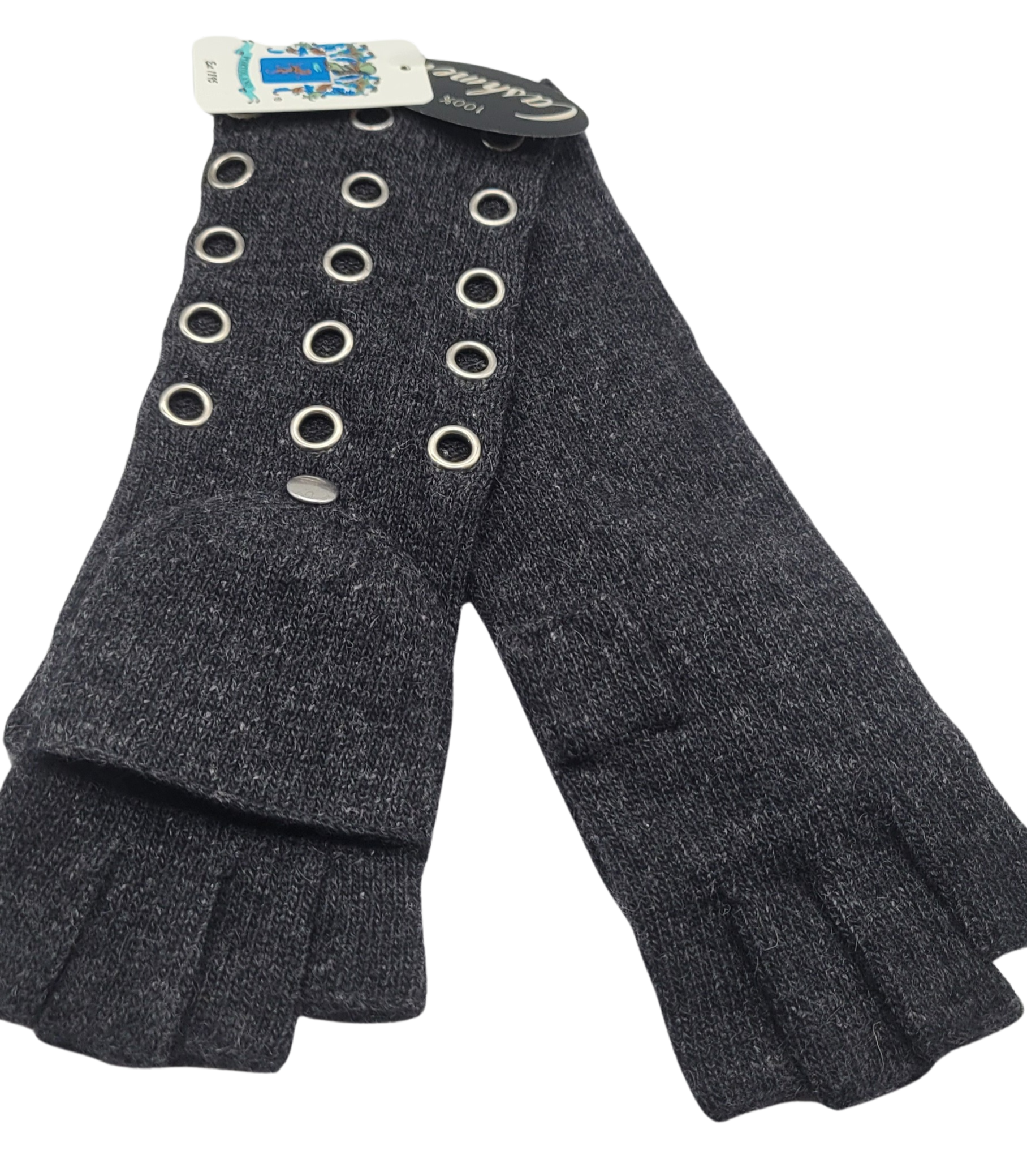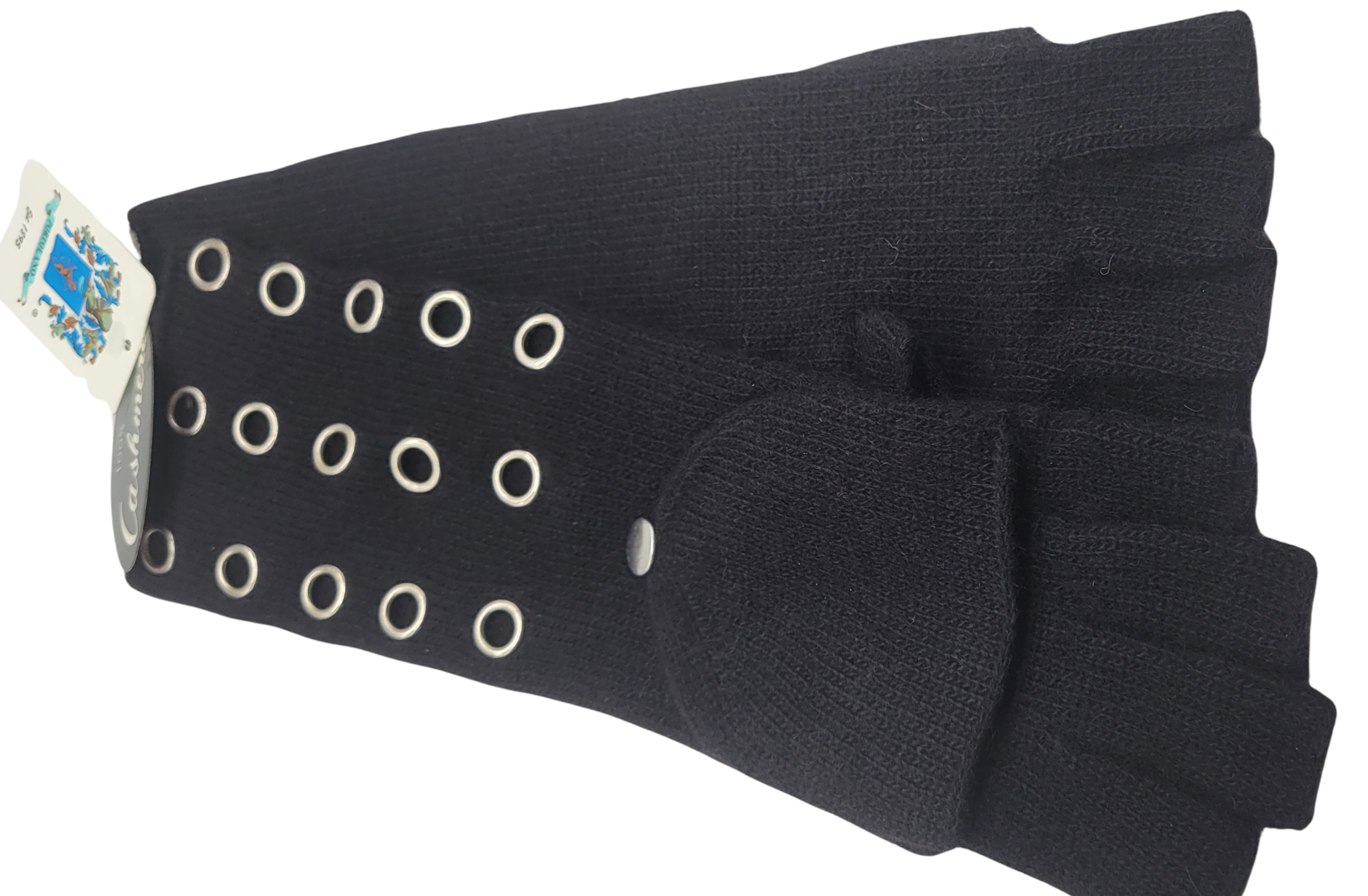 100% CASHMERE Gloves, women's, with stylish oversize grommets , cut fingers and an attached mitten that covers 4 fingers, no cover for thumb, keep your thumbs ready for fast texting .