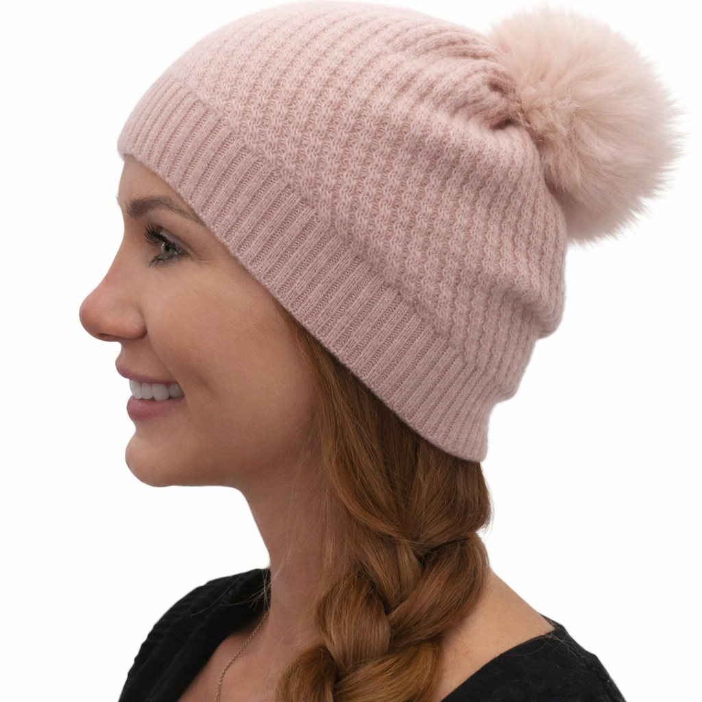 Pretty in soft pink, asymetrical stitch with a ribbed edge . Shearling colour matched pom.