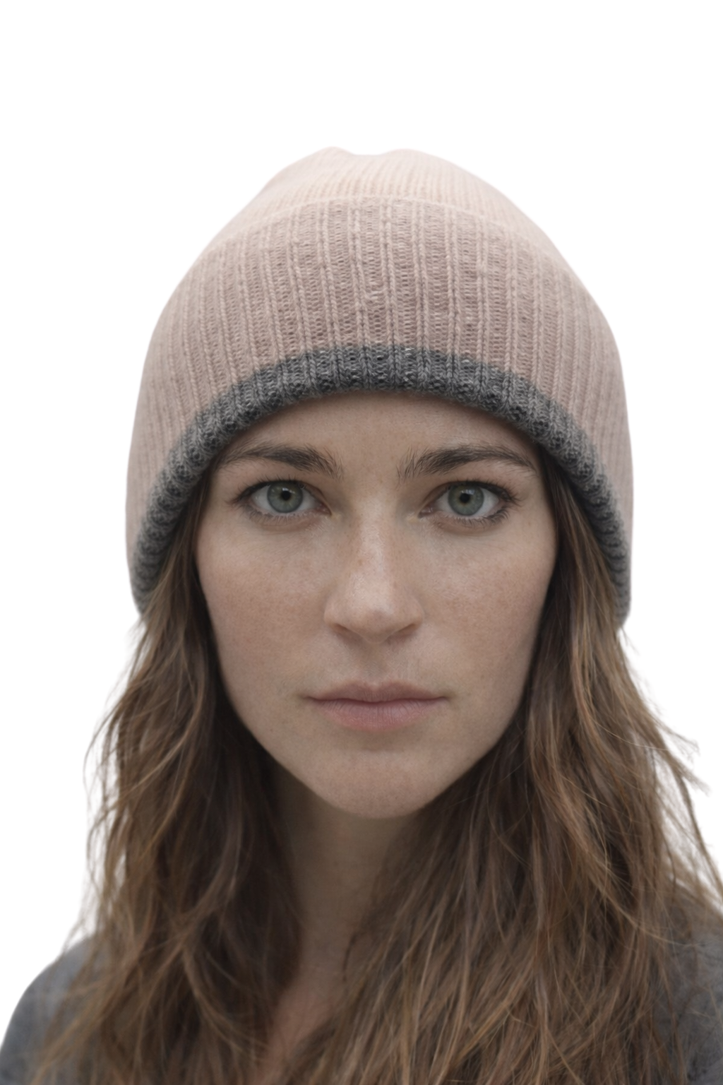 Pretty in soft pink hat with just a touch of light heather grey framing your face. Cashmere
