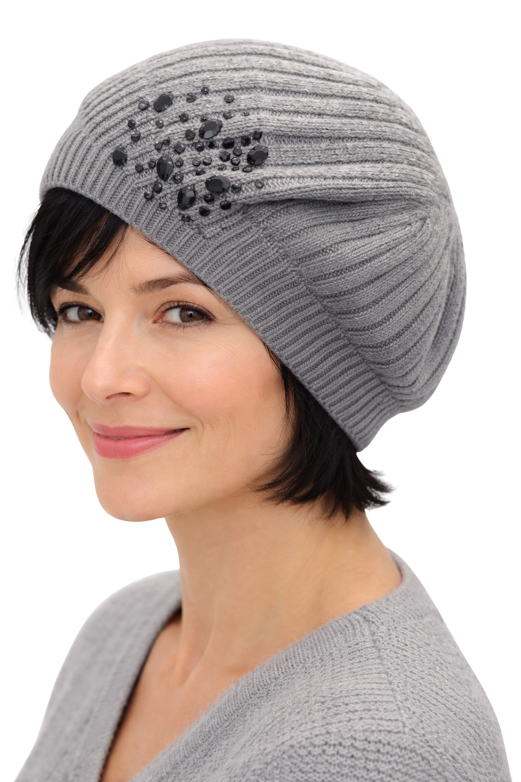Jewelled elegance , understated Onyx crystals, Cashmere ribbed Beret